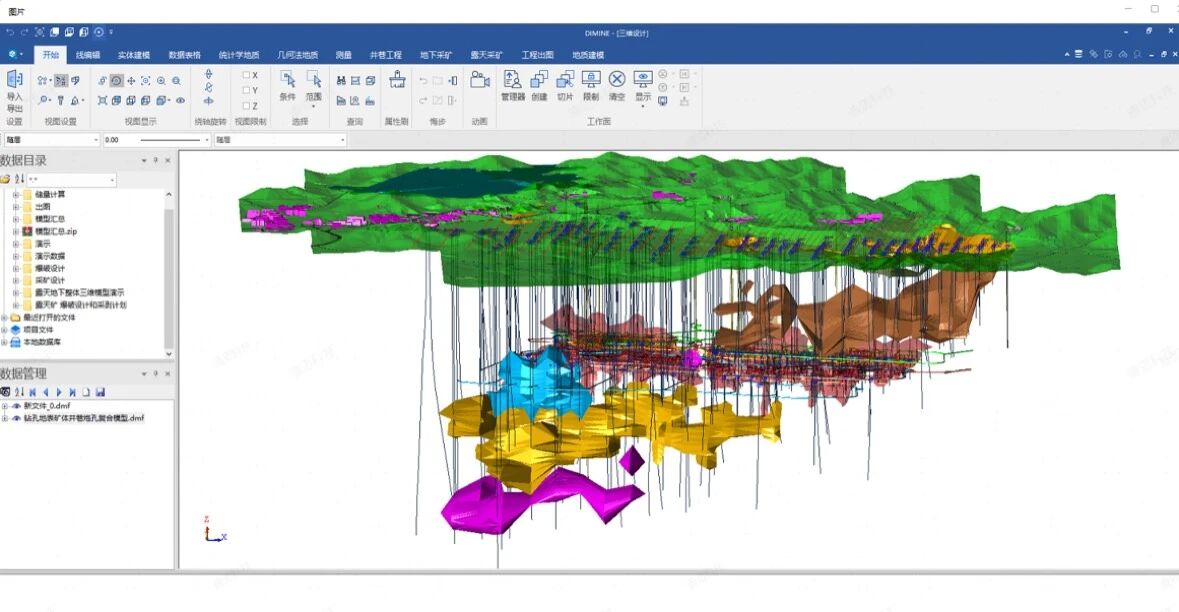 圖1-利用DIMINE構(gòu)建包含地形、礦體、邊坡等要素的三維實(shí)體模型